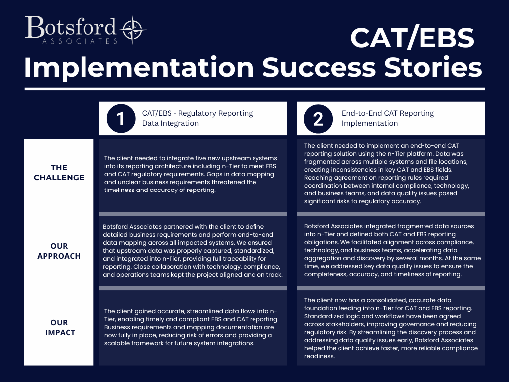 We recently helped clients untangle complex EBS and CAT reporting challenges, integrating fragmented systems, fixing data quality issues, and accelerating compliance readiness.