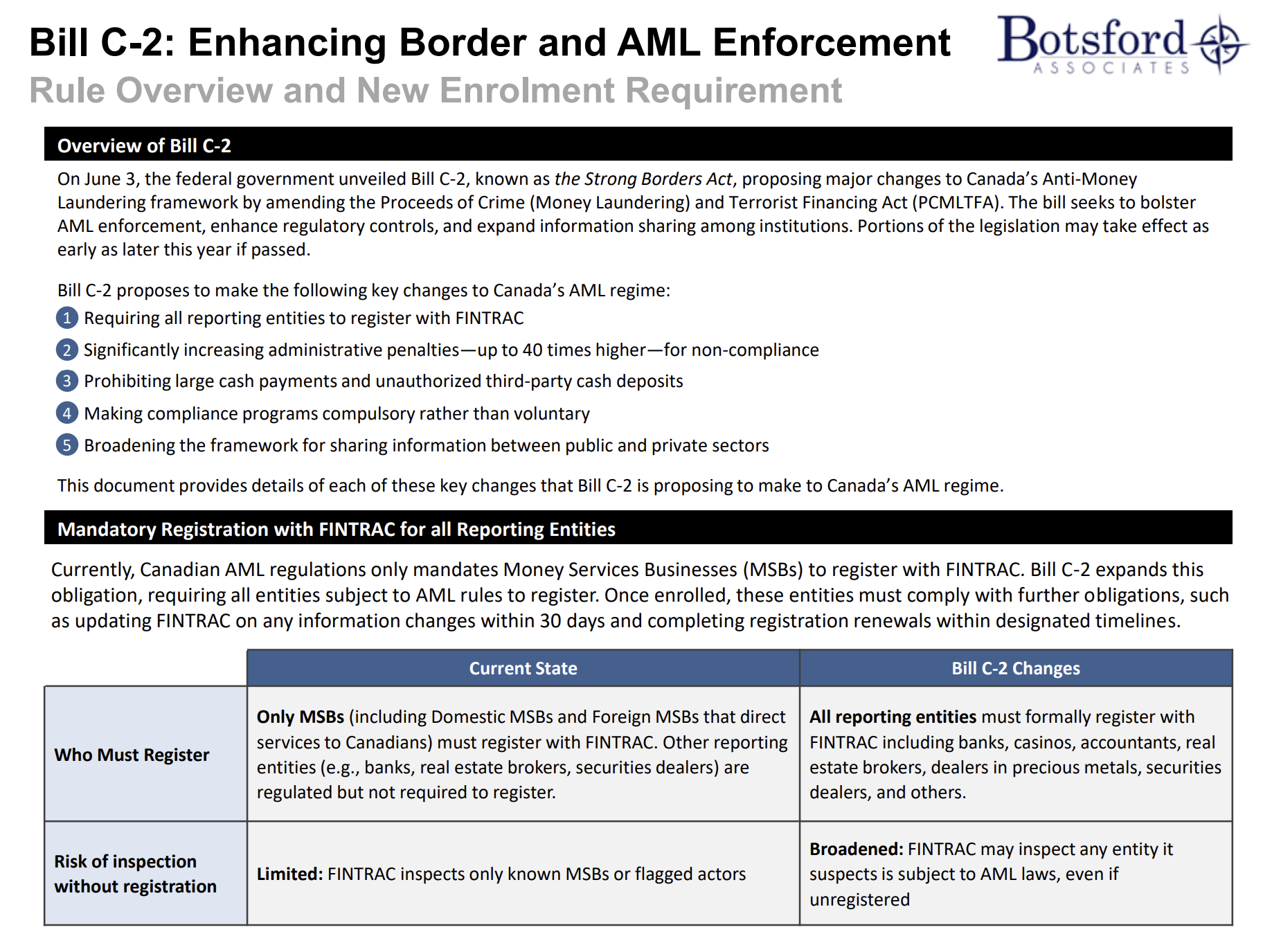 Rule Overview and New Enrolment Requirement, Mandatory Registration with FINTRAC for all Reporting Entities, Expanded Penalties for Non-Compliance, New Restrictions on Cash Transactions, Compliance Program Requirements, Expanded Information Sharing