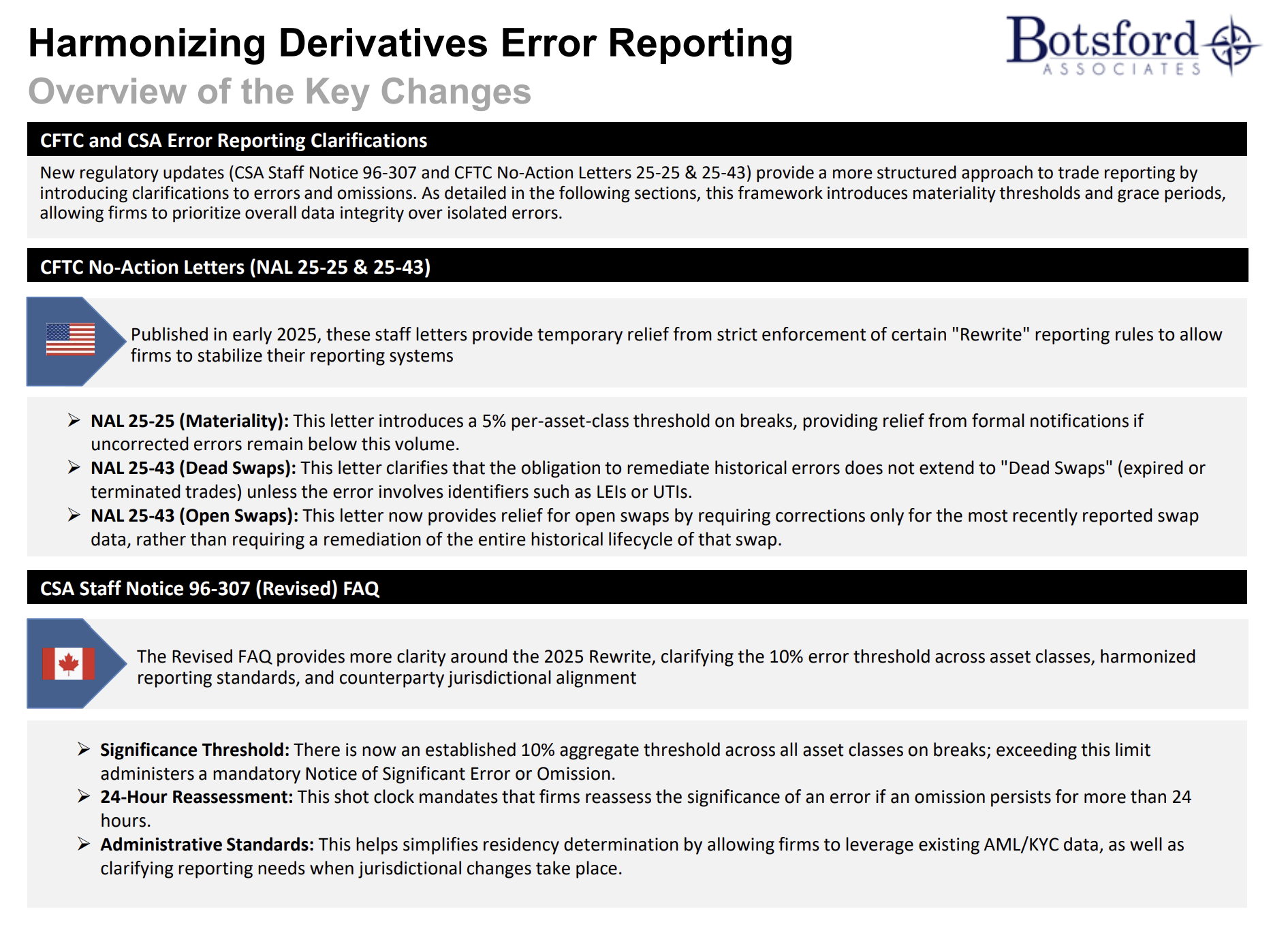 Recent updates from the CFTC and CSA are reshaping how firms approach derivatives reporting errors. With the introduction of materiality thresholds, relief on historical corrections, and clearer guidance on what constitutes a “significant” error, regulators are signaling a shift toward pragmatic, risk-based reporting. We break down these changes and what they mean in practice, including: New 5% (CFTC) and 10% (CSA) error thresholds, Relief on “dead swaps” and limitations on historical remediation, and Key operational differences firms must manage across jurisdictions.