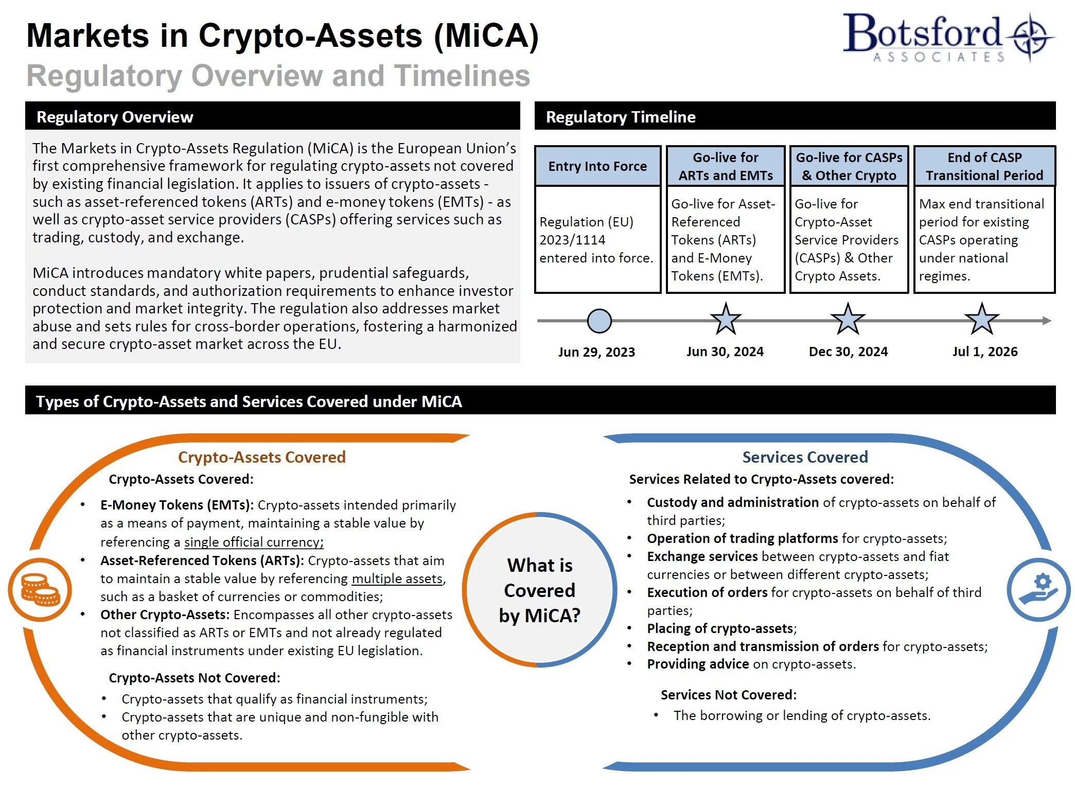 Regulatory Overview & Timeline, Types of Crypto-Assets and Services Covered under MiCA, Rules for Issuers of Crypto-Assets, Crypto-Asset Service Providers (CASPs) Regulatory Framework and Prevention of Market Abuse Involving Crypto-Assets